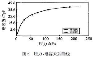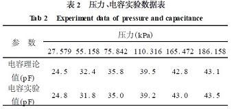 1可見(jiàn),擬合的電容誤差小于1%。由此可見(jiàn),在不同的時(shí)刻測(cè)得UO(t),通過(guò)曲線擬合得出參數(shù)RC。再給電路加小信號(hào)直流電源,測(cè)出R值,即求得C,通過(guò)C值則可知被測(cè)環(huán)境的壓力。圖5為350℃時(shí),不同的壓力所對(duì)應(yīng)的電容的理論值和實(shí)驗(yàn)值,從實(shí)驗(yàn)數(shù)據(jù)(表2)可得,在測(cè)壓的過(guò)程中,利用模型識(shí)別的方法,誤差較小,其測(cè)壓誤差小于2%。