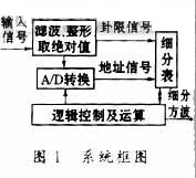 細分主要由以下幾個部分構(gòu)成,取絕對值、提取卦限信號、A/D轉(zhuǎn)換、查細分表、邏輯運算等。系統(tǒng)框圖如圖1所示。