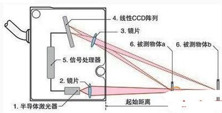 激光發(fā)射器通過鏡頭將可見紅色激光射向物體表面,經(jīng)物體反射的激光通過接受器鏡頭,被內(nèi)部的CCD線性相機(jī)接受,根據(jù)不同的距離,CCD線性相機(jī)可以在不同的角度下“看見”這個光點(diǎn)。根據(jù)這個角度即知的激光和相機(jī)之間的距離,數(shù)字信號處理器就能計算出傳感器和被測物之間的距離。
