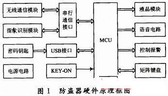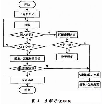 主要工作原理如下:車主停車熄火后,防盜器進(jìn)入鎖定狀態(tài)。此時(shí)如果汽車鑰匙不在ON位,就不能進(jìn)行指紋識(shí)別;只有當(dāng)汽車鑰匙在ON位,才可用指紋識(shí)別解鎖防盜器并自動(dòng)點(diǎn)火。在鎖定狀態(tài)下,汽車的油路、電路等被切斷,汽車鑰匙無法點(diǎn)火;如果強(qiáng)行剪斷指紋采集模塊和控制盒的連線,或者不識(shí)別指紋而強(qiáng)行用汽車鑰匙點(diǎn)火,汽車會(huì)通過鳴號(hào)、閃燈和無線通信網(wǎng)絡(luò)報(bào)警。在鎖定狀態(tài)插入密碼鑰匙可進(jìn)入解鎖狀態(tài),并可根據(jù)LCD和語(yǔ)音提示通過小鍵盤進(jìn)行指紋注冊(cè)/刪除、手機(jī)號(hào)碼設(shè)置和應(yīng)急點(diǎn)火等操作。