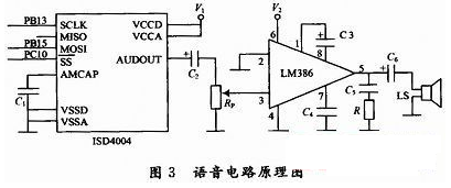 語(yǔ)音電路原理圖如圖3所示,由美國(guó)ISD公司的語(yǔ)音芯片ISD4004-16和美國(guó)國(guó)家半導(dǎo)體公司的音頻功率放大器LM386等元件構(gòu)成。ISD4004 -16錄放時(shí)間為16 min(可分段),它采用CMOS技術(shù),單電源3 V工作,內(nèi)含振蕩器、抗混疊濾波器、平滑濾波器、音頻放大器、自動(dòng)靜噪及高密度多電平閃爍存貯陳列。它內(nèi)置微控制器SPI總線串行通信接口。可將模擬語(yǔ)音數(shù)據(jù)直接寫入單個(gè)存儲(chǔ)單元,不需通過A/D或D/A轉(zhuǎn)換。使得ISD語(yǔ)音電路具有音質(zhì)自然、使用方便、單片存儲(chǔ)、反復(fù)錄放、低功耗、抗斷電等許多優(yōu)點(diǎn)。LM386工作電壓范圍寬,電壓增益可調(diào)。具有自身功耗低、電壓增益可調(diào)整電源電壓范圍大、外接元件少和總諧波失真小等特點(diǎn)。本設(shè)計(jì)中STM32F103VC通過SPI2給ISD4004傳送語(yǔ)音信息。圖3中的V1和V2分別經(jīng)三極管與+3.3 V和+12 V電源相連,三極管的通斷由STM32F103VC的PCI1和PCI2控制,只有在需要語(yǔ)音提示時(shí),才使三極管導(dǎo)通給ISD4004和LM386供電。