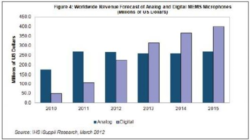 據(jù)IHS公司的MEMS專題報告,由于具有對電磁干擾的免疫力較高和設計階段具有更大的靈活性等優(yōu)點,越來越多地被用于手機、筆記本以及蘋果iPad等暢銷產(chǎn)品之中,數(shù)字MEMS麥克風的銷售額明年將超過模擬產(chǎn)品。