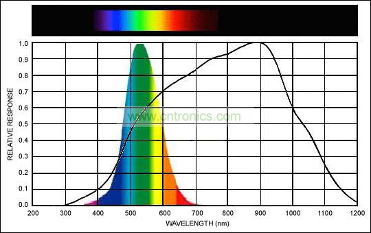 這里還存在一個(gè)更細(xì)微的問題。具體而言,理想情況下,應(yīng)確保環(huán)境光的測(cè)量模擬了人眼對(duì)光線的響應(yīng)機(jī)制。這通常借助CIE提供的視覺亮度曲線(圖3)。然而,光電二極管很少能夠完全模擬這種響應(yīng)機(jī)制,因?yàn)樗鼈兺ǔ>哂泻芨叩募t外(IR)靈敏度。在IR強(qiáng)度較大的光照條件(譬如白熾燈或日光)下,這種紅外靈敏度會(huì)造成錯(cuò)誤地判斷光線強(qiáng)度。
