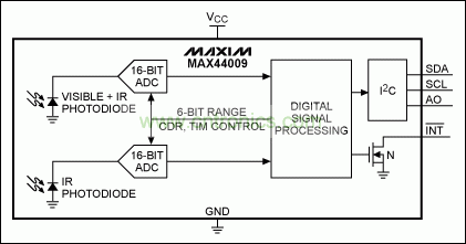 圖4提供了MAX44009的功能框圖,采用I²C通信協(xié)議,使其與微控制器的連接方式更簡(jiǎn)單,數(shù)據(jù)傳輸速度更快。除此之外,該解決方案的高集成特性使其能夠置于柔性電纜,安裝在離主電路板距離合適的位置。