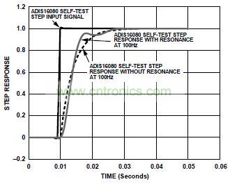 確定傳感器步進響應對于隔離在確定帶寬特性時觀察到的諧振條件很有用。圖1所示為一種采用ADIS16080的系統(tǒng)的頻率響應。圖中所示諧振頻率為100 Hz。開始時,該諧振到底是傳感器行為導致,還是系統(tǒng)中的機械諧振所導致,這并不清楚。幸運的是,步進響應(如自測功能所確定)可以區(qū)分這兩種效應。圖2顯示了兩種條件下的坐標曲線圖:測試設(shè)置導致的諧振和傳感器本身導致的諧振。