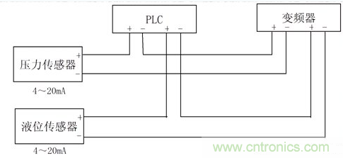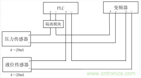 對(duì)于傳感器輸出的電流信號(hào),只經(jīng)PLC和變頻器的輸入阻抗之和不大于傳感器的輸出負(fù)載阻抗即可,壓力傳感器的信號(hào)可以同時(shí)串入PLC和變頻器,如只有壓力傳感器信號(hào),則PLC和變頻器也都可以正常接收壓力傳感器的信號(hào)。而當(dāng)液位傳感器的信號(hào)也同時(shí)接入PLC和變頻器時(shí),因PLC接收信號(hào)的-端都在變頻器的+端,當(dāng)兩傳感器的信號(hào)電流不一樣時(shí),就有可能使PLC兩-端的電位有較大的差異,就就形成了共模干擾電壓。如PLC輸入端又互相不是隔離的,則會(huì)造成PLC的模擬信號(hào)輸入端接收不正常。變頻器的兩輸入信號(hào)是在PLC的后面,其-端電位可保持在變頻器內(nèi)部電路設(shè)定的狀態(tài),問題不大。