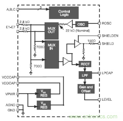 PCB還可能受到寄生電容的影響,這種電容最大可達(dá)20pF,它會(huì)在電容觸摸傳感器視為受到按壓時(shí),使閾值發(fā)生偏移,從而改變其靈敏度。為了對(duì)寄生電容進(jìn)行補(bǔ)償,可以采用對(duì)DAC編程的方法,以抵消CDC的輸入。對(duì)于各PCB來(lái)說(shuō),這種寄生電容是一致的,因此可以在制造PCB的時(shí)候進(jìn)行簡(jiǎn)單的調(diào)整,這樣就不需要外部RC調(diào)諧元件,從而使材料、裝配和測(cè)試相關(guān)的成本最低。單獨(dú)調(diào)整每個(gè)傳感器的偏移,使設(shè)計(jì)者可以充分利用轉(zhuǎn)換器的分辨率。