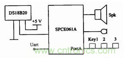 綜上所述,整體硬件電路組成如圖1所示,由SCPE061A單片機(jī)實(shí)現(xiàn)系統(tǒng)整體控制并實(shí)現(xiàn)語(yǔ)音或鍵盤編程與語(yǔ)音播報(bào),系統(tǒng)可通過(guò)通用異步串行接口實(shí)現(xiàn)聯(lián)網(wǎng)功能,在不需要聯(lián)網(wǎng)的場(chǎng)合,溫度計(jì)也可以單獨(dú)使用,實(shí)現(xiàn)了系統(tǒng)的可裁剪,DSl8B20用來(lái)實(shí)現(xiàn)溫度檢測(cè)。