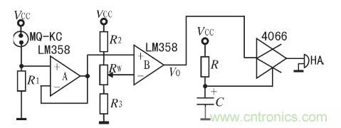 圖1所示的基本報警電路的不足:一開始加電時,傳感器尚未達(dá)到穩(wěn)態(tài),其電阻值較小,VR1較大,導(dǎo)致蜂鳴器HA誤報警。為了解決這一問題,采用一個數(shù)字信號控制的模擬開關(guān),其控制信號采用簡單的電容充電延時電路,原理圖如圖2所示。圖1中比較器B的輸出V0加到模擬開關(guān)4066的輸入端,開關(guān)的輸出端接蜂鳴器HA。初始加電時,電容C上的電壓VC為0,4066不導(dǎo)通,無論V0值為多高,HA都不會報警。隨著電容充電,VC不斷升高,當(dāng)達(dá)到4066的控制門限閾值時,4066才導(dǎo)通,即能進(jìn)入報警狀態(tài)。電容充電使其電壓達(dá)到4066的控制門限閾值時間即為延時時間。電容C和電阻R的取值可根據(jù)延時要求確定。為可靠起見,取RC=1/2T,T為傳感器初始穩(wěn)定時間。本裝置取R=l MΩ,C=100μF,即能實現(xiàn)可靠的延時。