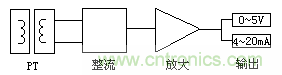 交流信號(hào)又分為交流電壓和電流信號(hào)。圖1為交流電流信號(hào)的檢測(cè)原理框圖,圖2為交流電壓信號(hào)的檢測(cè)原理框圖,由CT和PT對(duì)信號(hào)進(jìn)行隔離,電流為穿孔輸入方式,電壓為端子接線輸入方式。