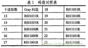 編碼采用格雷碼(Gray)為數(shù)值碼,以某一固定碼寬為參考碼R,它用于標(biāo)尺定位和提高精度。Gray碼是一種絕對編碼方式的無權(quán)碼,它所具有的循環(huán)、單步特性能消除隨機取數(shù)時出現(xiàn)重大誤差的可能,其任意兩個柏鄰整數(shù)之間轉(zhuǎn)換時,只有一個位數(shù)發(fā)生變化,大大減少了由一個狀態(tài)轉(zhuǎn)到下一個狀態(tài)時的邏輯混淆,具有較強的容錯能力。以6位編碼為例,其部分十進制數(shù)與Gray碼的一一對應(yīng)關(guān)系如表1所示。