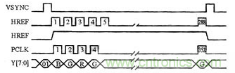 圖2中,每一個(gè)幀同步信號(hào)VSYNC周期包含288個(gè)水平同步信號(hào)HREF脈沖,而每一個(gè)HREF周期包含352個(gè)PCLK時(shí)鐘脈沖,每一個(gè)PCLK時(shí)鐘可輸出一個(gè)RGB像素的視頻數(shù)據(jù)。