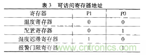 寄存器指針是向用戶提供所要訪問寄存器地址,寄存器指針的內(nèi)容即為可訪問寄存器地址。由于DS75LX內(nèi)部只含有4個可訪問寄存器,因此寄存器指針的內(nèi)容只有低兩位(P1、P0)有效,當(dāng)訪問某個寄存器時,必須確保寄存器指針已指向該寄存器。P1和P0的值與可訪問寄存器對應(yīng)關(guān)系如表3所示。
