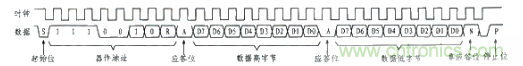 DX75LX的讀寫操作是通過兩線串行總線接口實(shí)現(xiàn)的,該串行總線與I2C總線兼容。圖2所示為讀溫度及溫度門限寄存器的時序圖。此時假定寄存器指針已指向溫度寄存器,否則需要對指針進(jìn)行設(shè)置。設(shè)置方法如下:主器件產(chǎn)生起始位、發(fā)送包含DS75LX地址的寫命令、收到應(yīng)答、發(fā)送寄存器指針字節(jié)。注意只有指針字節(jié)的低兩位(P1、P0位)有效。
