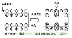 當(dāng)一些晶體受熱時(shí),在晶體兩端將會(huì)產(chǎn)生數(shù)量相等而符號(hào)相反的電荷,這種由于熱變化產(chǎn)生的電極化現(xiàn)象,被稱為熱釋電效應(yīng)。通常,晶體自發(fā)極化所產(chǎn)生的束縛電荷被來(lái)自空氣中附著在晶體表面的自由電子所中和,其自發(fā)極化電矩不能表現(xiàn)出來(lái)。當(dāng)溫度變化時(shí),晶體結(jié)構(gòu)中的正負(fù)電荷重心相對(duì)移位,自發(fā)極化發(fā)生變化,晶體表面就會(huì)產(chǎn)生電荷耗盡,電荷耗盡的狀況正比于極化程度,圖1表示了熱釋電效應(yīng)形成的原理。