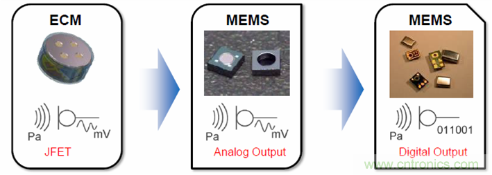 下圖展示了微型麥克風的技術(shù)演進過程。