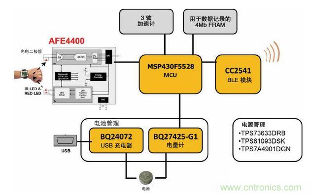 圖4中就是這樣一個(gè)TIDesign (TIDA-00011),其中展示了一個(gè)典型的光學(xué)、佩帶在手腕上的心率系統(tǒng)應(yīng)用。這個(gè)手腕佩帶式心率監(jiān)視器參考設(shè)計(jì)說(shuō)明了TI技術(shù)是如何組合在一起來(lái)提供完整解決方案的。使用一個(gè)LED到光電二極管光信號(hào)的轉(zhuǎn)換,TI的AFE4400($3.3188)感測(cè)由佩帶者脈搏跳動(dòng)所引起的皮膚表面變化,然后將模擬信號(hào)放大并轉(zhuǎn)換為數(shù)字信號(hào),然后再將此數(shù)字信號(hào)傳遞給MSP430($2.0250) MCU?;赥I SimpleLinkTM Bluetooth低能耗CC2541($2.3625)無(wú)線MCU的模塊提供到智能手機(jī)或其他本地系統(tǒng)的無(wú)線連接。非易失性鐵電隨機(jī)存儲(chǔ)器提供數(shù)據(jù)記錄功能,而加速計(jì)感測(cè)身體運(yùn)動(dòng)。此參考設(shè)計(jì)還包括管理電池電量和不同系統(tǒng)功能的器件。希望設(shè)計(jì)此類(lèi)終端設(shè)備的開(kāi)發(fā)人員可以從TI直接訪問(wèn)所有內(nèi)容,原樣搭建這一系統(tǒng),并且立即運(yùn)行。在這里,要定制解決方案,開(kāi)發(fā)人員只需添加其自己的知識(shí)產(chǎn)權(quán)即可。