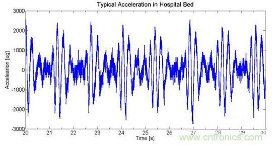 在最近的一項(xiàng)項(xiàng)目設(shè)計(jì)中,村田的工程師們分析了病人在病床上的活動(dòng),并分離出了心搏圖數(shù)據(jù),心搏圖數(shù)據(jù)如圖3,從中可以看到床的諧振影響到信號(hào),且隨時(shí)間衰減。而可靠的測量信號(hào)在10mg范圍,這需要加速度傳感器的分辨率特別的高,適合此應(yīng)用的傳感器之一是村田的SCA61T,其噪聲密度大約是14μg/√Hz。