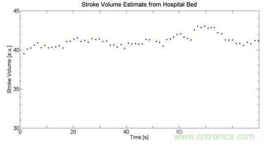 通過先進(jìn)的濾波算法,可以從病床的諧振與噪聲中分離出心搏圖數(shù)據(jù),如圖4估算出的心率和搏量,其中的血搏量是不帶單位的數(shù)據(jù),它需要進(jìn)行標(biāo)定才能等到一個(gè)絕對值。圖4中的搏量變異性估算得相當(dāng)準(zhǔn)確,它可以用于估算呼吸率。
