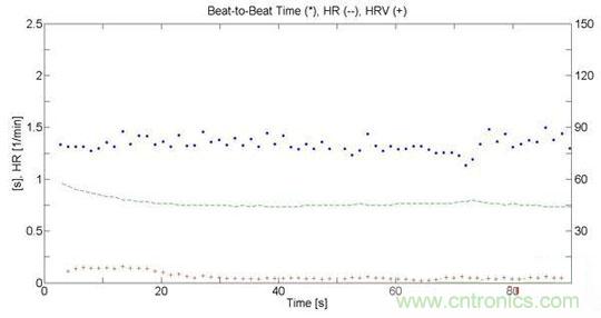 圖4中的點(diǎn)與點(diǎn)之間的時(shí)間就是心臟跳動(dòng)的時(shí)間,心率及心率變異性可以從中計(jì)算出來,如圖5。村田的工程師也在電子稱上使用SCA61T測量出相同的心搏圖數(shù)據(jù),當(dāng)然,在電子稱上因?yàn)槿说倪\(yùn)動(dòng),噪聲更大,如圖六。