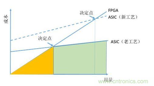 從上圖可以看出,FPGA由于沒有NRE,在用量較小的時候成本優(yōu)勢明顯。由于FPGA單個芯片成本高于ASIC,所以有較大斜率。在決定點位置以后,ASIC開始有成本優(yōu)勢。所以從成本因速考慮選用FPGA還是ASIC,與用量有很大關系。