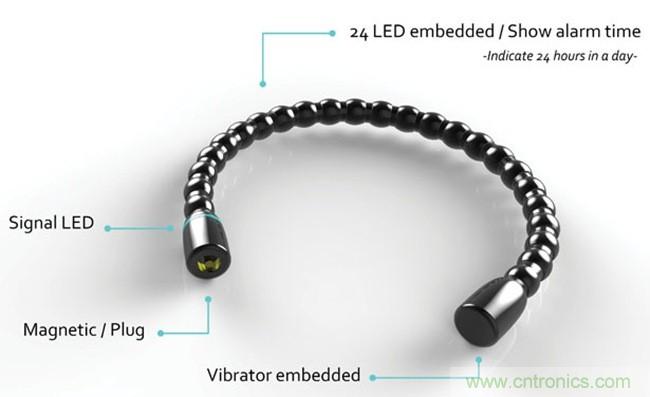 而手鏈采用磁性連接頭作為連接環(huán),連接頭上有指示燈,通過不同的顏色來指示電池的電量,連接頭也有USB接口,可以通過適配器來為智能手鏈充電。同時這款智能手鏈內(nèi)置了藍牙模塊,可以通過藍牙連接智能手機,用戶可以通過手機程序來設(shè)置鬧鐘時間,讓智能手鏈用溫柔的震動喚醒自己。