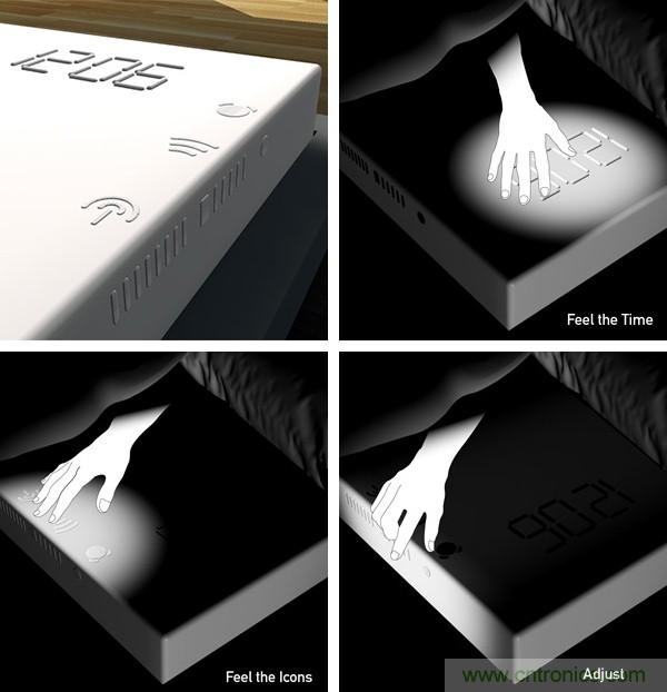 這個有趣的想法是將鬧鐘設(shè)計在床上,可以時間顯示、有鬧鐘開關(guān)、音量調(diào)節(jié)、功能設(shè)置等凸起按鈕,它們都被隱藏在床單下面,不必睜開雙眼,通過觸摸,我們就可以知曉和調(diào)節(jié)時間。這些模塊是采用一種仿生材料制成的,這種材料又被稱為人工肌肉。它通過收縮或者膨脹來改變外形,從而達到變幻時間顯示數(shù)字的效果。