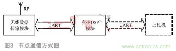 在傳感器網(wǎng)絡(luò)中,采用ZigBee通信協(xié)議時,節(jié)點被分為Coordinator、Router以及End Device三種。Coordinator負(fù)責(zé)系統(tǒng)的初始化工作,選擇網(wǎng)絡(luò)的信道等參數(shù)建立網(wǎng)絡(luò),供其他節(jié)點加入;Router負(fù)責(zé)節(jié)點之間命令消息的路由轉(zhuǎn)發(fā)實現(xiàn);End Device負(fù)責(zé)任務(wù)是消息的發(fā)送和接收,只能和父節(jié)點進(jìn)行數(shù)據(jù)通信,不具有路由轉(zhuǎn)發(fā)的功能。在本系統(tǒng)中,Sink節(jié)點主要負(fù)責(zé)監(jiān)控網(wǎng)絡(luò)的建立、上位機(jī)命令的分析處理和操作、數(shù)據(jù)的收集等任務(wù),是整個網(wǎng)絡(luò)的數(shù)據(jù)存儲和處理中心,在上位機(jī)和監(jiān)控網(wǎng)絡(luò)之間起到橋梁的作用,是系統(tǒng)應(yīng)用中的Coordinator。監(jiān)控網(wǎng)絡(luò)區(qū)域內(nèi)的待定位節(jié)點要具備消息轉(zhuǎn)發(fā)與路由其他節(jié)點的能力,需要可以給所有節(jié)點發(fā)送消息,也可以接收到所有節(jié)點的消息,是系統(tǒng)應(yīng)用中的Router。每個節(jié)點由無線數(shù)據(jù)傳輸模塊和主控DSP模塊組成,同一節(jié)點的兩個模塊之間通過UART總線進(jìn)行通信。節(jié)點之間通過無線RF射頻方式進(jìn)行通信。Sink節(jié)點與上位機(jī)使用UART總線進(jìn)行通信,未知節(jié)點的通信方式中并不包含該通信方式。節(jié)點的通信方式如圖3所示。