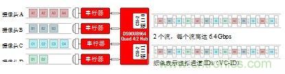 圖3所示為四攝像頭系統(tǒng),具有由彩色塊所示的不同數(shù)據(jù)速率。聚合數(shù)據(jù)在移動工業(yè)處理器接口(MIPI)攝像頭串行接口(CSI)-2端口0和1兩者處呈現(xiàn)。CSI-2總線具有“突發(fā)性”,意味著其以固定數(shù)據(jù)速率運行、將發(fā)送數(shù)據(jù)為可用狀態(tài),并且當機器空閑時恢復到低功率(LP)狀態(tài)。因此,傳感器速度可在不改變ECU處理器時序的條件下進行變化。即使傳感器鏈路以獨立頻率運行,解串器集線器在單個參考時鐘上也可將數(shù)據(jù)提供給片上系統(tǒng)(SoC)處理器,從而簡化系統(tǒng)時序。