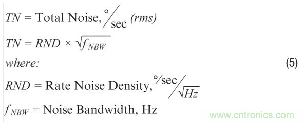 提供連續(xù)指向控制的系統(tǒng)開發(fā)者可能更愿意從角速率方面來評估噪聲影響,因?yàn)樗麄兛赡軟]有固定的積分時(shí)間來利用基于ARW的關(guān)系。從角速率方面評估噪聲常常要考慮RND參數(shù)和陀螺儀信號鏈的頻率響應(yīng)。對陀螺儀頻率響應(yīng)影響最大的常常是濾波,其支持環(huán)路穩(wěn)定標(biāo)準(zhǔn)的專用要求,并能抑制對 環(huán)境威脅(如振動)的不相干傳感器響應(yīng)。公式5給出了一種簡單方法來估算與特定頻率響應(yīng)(噪聲帶寬)和RND相關(guān)的 噪聲。