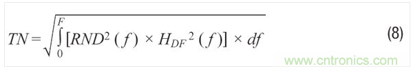 若系統(tǒng)需要定制濾波,其頻率響應(yīng) (HDF(f)) 不符合公式6和7中的簡單單極點(diǎn)和雙極點(diǎn)模型,則可利用公式8提供的更一般關(guān)系來預(yù)測總噪聲: