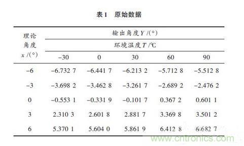 由于各軸的檢測(cè)原理是相同的,因此本論文采用x軸的檢測(cè)數(shù)據(jù)進(jìn)行實(shí)驗(yàn)驗(yàn)證。主要的實(shí)驗(yàn)儀器有被測(cè)姿態(tài)傳感器、經(jīng)緯儀、高低恒溫箱、高精度角度檢測(cè)儀等。表1所得數(shù)據(jù)是未經(jīng)溫度補(bǔ)償時(shí)的實(shí)驗(yàn)數(shù)據(jù),即原始數(shù)據(jù)。