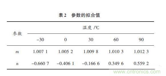依次求出不同溫度下參數(shù)m 和n 的值,計(jì)算結(jié)果如表2所示。