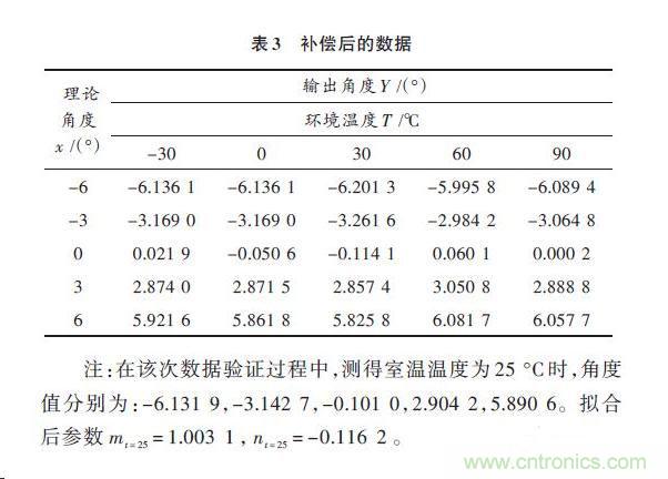 根據(jù)式(1)、(2)、(7)可得補(bǔ)償后的輸出值。償后的數(shù)據(jù)如表3所示。在表1中未補(bǔ)償前的最大誤差角度為0.682 7°,表3中補(bǔ)償后的最大誤差角度為0.261 6°,相對(duì)減少的誤差角度為0.421 1°。
