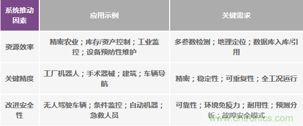 工業(yè)機械和流程最具價值的進步集中在有形的系統(tǒng)級優(yōu)勢上,而這通常會帶來設(shè)計和實現(xiàn)方面的挑戰(zhàn),這些挑戰(zhàn)又會發(fā)展成新的問題解決方案和業(yè)務(wù)模式。這種系統(tǒng)級推動因素可以歸納為三項追求,即對資源效率、關(guān)鍵精度和更高安全性的追求。瞄準(zhǔn)這些橫跨多個行業(yè)的改進的應(yīng)用,包括跨越空中/地面/海上、室內(nèi)/室外、短期/長期和人/機等,但無論如何,它們都依賴于共同的屬性;即精度、可靠性、安全性和智能處理與分析,如表1所示。