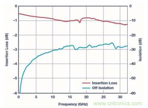 此基本的優(yōu)勢(shì)即可用來(lái)達(dá)成優(yōu)越的RF性能位準(zhǔn),再搭配上謹(jǐn)慎的設(shè)計(jì)。 圖五所示為針對(duì)原型QFN,單刀雙擲(SPDT)MEMS開關(guān)進(jìn)行量測(cè)所得的插入損耗以及關(guān)閉隔離。 插入損耗在26.5 GHz下只有1 dB,而且在QFN封裝當(dāng)中已經(jīng)實(shí)現(xiàn)了超過(guò)32 GHz的帶寬。