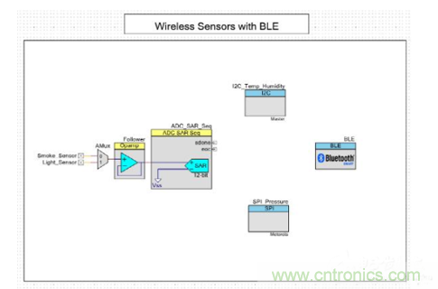 內(nèi)置BLE功能的處理器的靈活性和豐富資源,使傳感器能夠與單一BLE設(shè)備連接。圖2是使用PSoC Creator的典型配置。PSoC Creator是一個用于圍繞PSoC架構(gòu)開發(fā)應(yīng)用程序的IDE。圖中顯示的是模擬和數(shù)字傳感器接口以及BLE子系統(tǒng)。該配置展示的是用于感測煙霧、光照強(qiáng)度、溫度、濕度和壓力的典型工業(yè)數(shù)據(jù)監(jiān)測系統(tǒng)。配置中的每個組件都有一個關(guān)聯(lián)的應(yīng)用程序編程接口(API),開發(fā)人員可根據(jù)需要訪問這些組件。每個組件還有一個與其相關(guān)的數(shù)據(jù)表對組件的可用配置進(jìn)行說明。