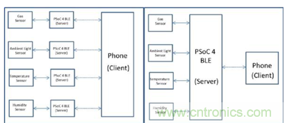 無線傳感器網(wǎng)絡(luò)通常作為網(wǎng)狀網(wǎng)絡(luò)和樞紐網(wǎng)絡(luò)(見圖1)。樞紐網(wǎng)絡(luò)包括可以放置在相同位置的所有傳感器。每個傳感器需要連接到單個BLE外圍設(shè)備(服務(wù)器)來處理數(shù)據(jù)并將其發(fā)送到BLE中央設(shè)備(客戶端)。網(wǎng)狀網(wǎng)絡(luò)采用可以遠(yuǎn)程定位傳感器的拓?fù)浣Y(jié)構(gòu)。網(wǎng)格中的每個節(jié)點(diǎn)都需要連接到BLE外圍設(shè)備(服務(wù)器),所有這些外圍設(shè)備都可以連接到BLE中央設(shè)備(客戶端)。