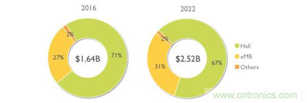 xMR磁阻傳感器市場的增長或與霍爾技術(shù)相結(jié)合,或搶占了后者的市場份額。根據(jù)Yole發(fā)布的《磁傳感器市場與技術(shù)-2017版》報告, xMR技術(shù)的主要優(yōu)勢體現(xiàn)在更高的靈敏度,因此它們主要用于電子羅盤和位置測量,尤其是精確的角度測量應(yīng)用。