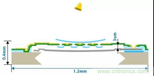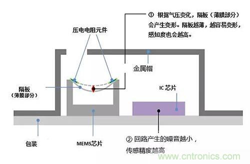 在封裝內(nèi)部,裝有懸掛在真空環(huán)境中的硅薄膜(隔膜),檢測外部空氣進(jìn)入隔膜后所產(chǎn)生的氣壓變化。為了提高傳感器的檢測精度,硅膜片必須做到盡可能薄,以便在感觸細(xì)微的氣壓后可以產(chǎn)生巨大的變形。