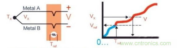 熱電偶是溫度測量中最常用的傳感器。其主要好處是寬溫度范圍和適應(yīng)各種大氣環(huán)境,而且結(jié)實、價低,無需供電,尤其最便宜。熱電偶由在一端連接的兩條不同金屬線(金屬A和金屬B)構(gòu)成,如圖1所示。當(dāng)熱電偶一端受熱時,熱電偶電路中就有電勢差??捎脺y量的電勢差來計算溫度。