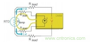 與熱敏電阻相似,鉑電阻溫度傳感器(RTD)也是用鉑制成的熱敏感電阻。當(dāng)通過測量電壓計算RTD 溫度時,數(shù)字萬用表用已知電流源測量該電流源所產(chǎn)生的電壓。這一電壓為兩條引線(Vlead)上的壓降加RTD上的電壓(Vtemp)。例如,常用RTD 的電阻為100Ω,每1℃僅產(chǎn)生0.385Ω的電阻變化。如果每條引線有10Ω電阻,就將造成26℃的測量誤差,這是不可接受的。所以應(yīng)對RTD作4線歐姆測量。
