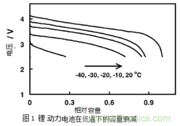 鋰動力電池在不同低溫下的放電容量曲線如圖1所示,與室溫20℃相比,低溫-20℃下容量衰減已經(jīng)比較明顯,到-30℃是容量損失更多,-40℃下容量連一半都不到了。