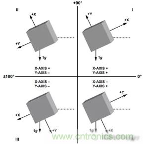 當360°旋轉單軸加速度傳感器時,每個加速度傳感器輸出值Ax可能會對應兩個角度。