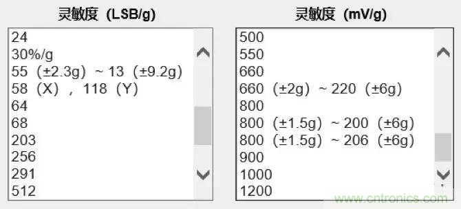 靈敏度(LSB/g)主要針對數字輸出加速度傳感器,代表一個重力加速度(g)下,輸出能區(qū)分多少位LSB。上面已經根據應用要求推導出,假設應用要求最小分辨率為1°,靈敏度需要大于58LSB/g。那么可以根據這一結果直接在參數欄里選擇。