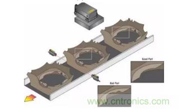 隨著過去幾年傳感技術(shù)的進(jìn)步,用戶現(xiàn)在能夠?qū)⒕哂谐杀拘б娴臏y(cè)量功能集成到他們的工藝中,分辨率高達(dá)0.0001英寸。在下一個(gè)制造步驟之前,可以自動(dòng)檢查零件的關(guān)鍵屬性。在圖示中,激光傳感器檢查在夾具中旋轉(zhuǎn)的鑄造輪,以確保在加工之前沒有空隙或過多的跳動(dòng)。