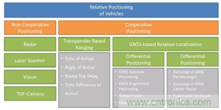 用于車輛相對(duì)定位的測(cè)距傳感器和技術(shù)可以概括為下圖,首先分為兩大類:非協(xié)作式定位和協(xié)作式定位。非協(xié)作式定位包括:雷達(dá)、激光掃描儀、視覺和TOF攝像機(jī);協(xié)作式定位包括:基于轉(zhuǎn)發(fā)器的測(cè)距(根據(jù)射頻信號(hào)直接估算相對(duì)距離)和基于GNSS的相對(duì)定位(通過通訊的方式傳遞GNSS測(cè)得的位置相關(guān)信息,包括GNSS解算得到的位置和原始的GNSS信息,如偽距)。具體對(duì)各個(gè)定位技術(shù)的介紹請(qǐng)參見原文,限于篇幅,本譯文只進(jìn)行部分翻譯,著重于定位需求的分析以及對(duì)各個(gè)定位技術(shù)的評(píng)價(jià)。